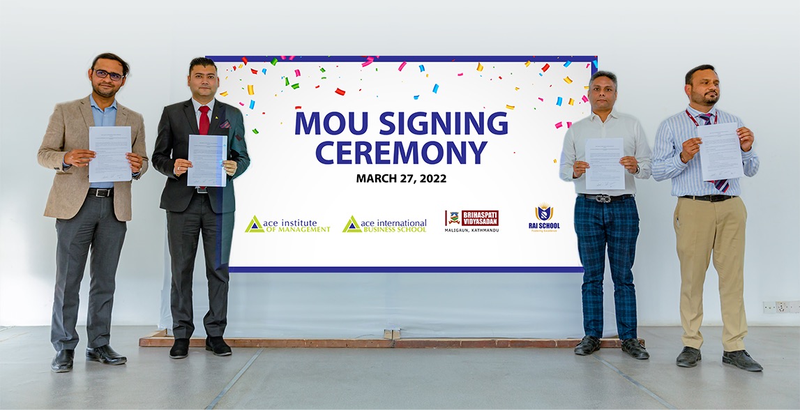 A Memorandum of Understanding (MoU) Signing Ceremony between Ace Institute of Management, Ace International Business School, Brihaspati Vidyasadan School, and Rai School was held on March 27, 2022 at Ace Auditorium , Ace Institute of Management.