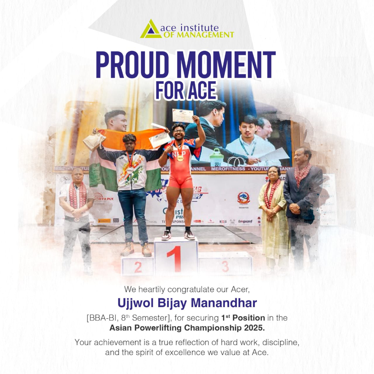 We are thrilled to share the outstanding achievement of our Acer, Ujjwol Bijay Manandhar, a proud student of BBA-BI, 8th Semester, who has made history by securing 1st Position at the Asian Powerlifting Championship 2025.