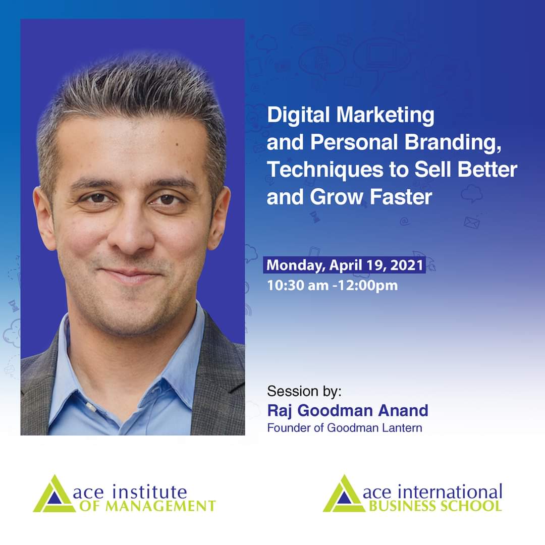 Ace successfully conducted a fruitful session on “Digital Marketing and Personal Branding: Techniques to Sell Better and Grow Faster” by Raj Goodman Anand for its students of both Ace Institute of Management and Ace International Business School. The session took place today, Monday, April 19, 2021, through a virtual platform, keeping in mind the current situation we are in. All the participants were delighted to be able to interact with Mr. Anand and be a part of the insightful session focused on Personal Branding, Embracing the digital growth we are currently facing with an emphasis on the importance of a website leading to conversion, email marketing, and SEO.